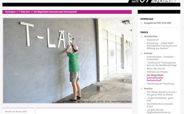 „In diesem Beitrag stelle ich das Tskaltubo Lab For Urgent Questions zur Diskussion, das seit 2013 jedes Jahr für knapp einen Monat im westgeorgischen Dorf Tskaltubo stattfindet. Das Lab lässt sich als ein partnerschaftliches Kunstprojekt von aus der Schweiz und aus Deutschland stammenden Mitgliedern des Kollektivs neue Dringlichkeit (nD) und jungen lokalen Menschen beschreiben. Grob umrissen handelt es sich um einen Raum, in dem sich die Beteiligten mit „Dringlichkeiten“, die sich ihnen in Tskaltubo stellen, beschäftigen. Es ist ein temporärer Ort für Austausch, für künstlerische und kulturelle Produktion, ein Treffpunkt und Hang-Out.“